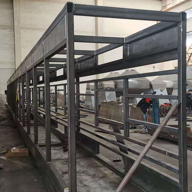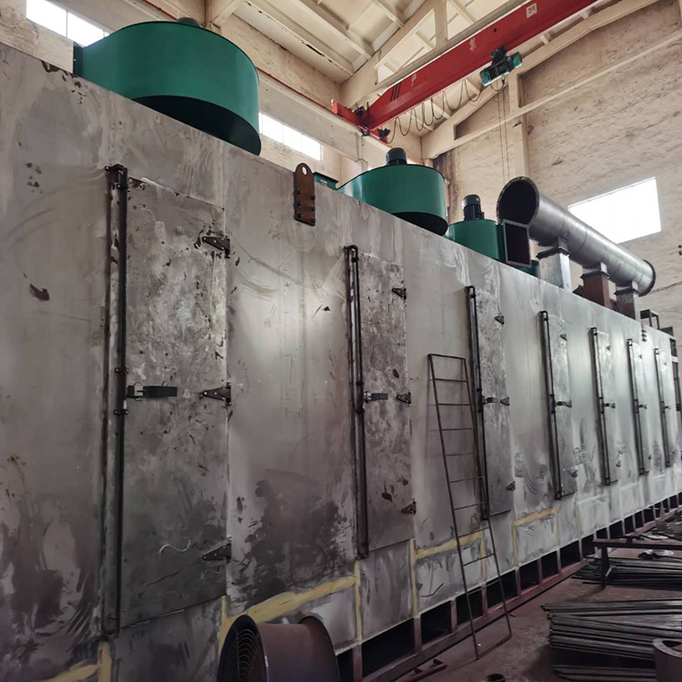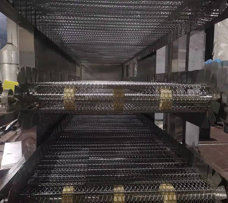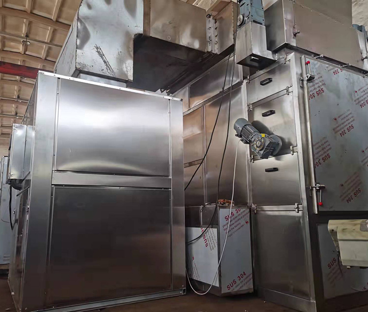 物料由加料器均勻地鋪在網(wǎng)帶上,網(wǎng)帶一般采用12-60目不銹鋼絲網(wǎng),由傳動裝置拖動在干燥機內(nèi)移動。干燥機由若干單元組成,每一單元熱風(fēng)獨立循環(huán),部分尾氣由專門排濕風(fēng)機排出,廢氣由調(diào)節(jié)閥控制,熱氣由下往上或由上往下穿過鋪滿物料的網(wǎng)帶完成熱量與質(zhì)量傳遞的進程,帶走物料水份。網(wǎng)帶緩慢移動,運行速度可根據(jù)物料溫度自由調(diào)節(jié),干燥后的成品連續(xù)落入收料器中。上下循環(huán)單元根據(jù)用戶需要可靈活配備,單元數(shù)量亦可根據(jù)需要選取。