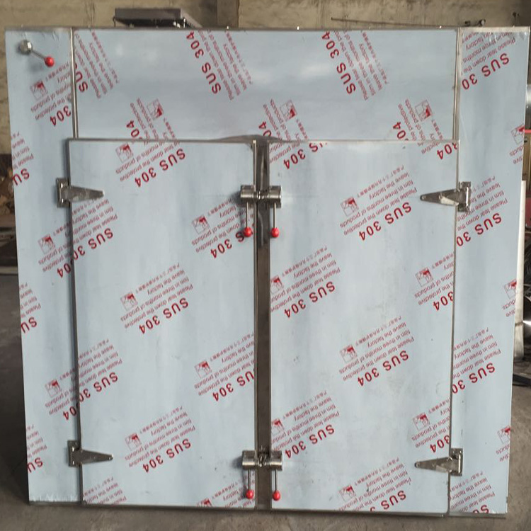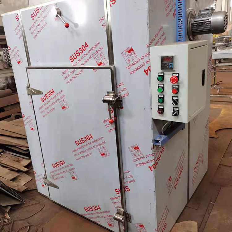 熱風(fēng)循環(huán)烘箱以空氣為載體,用蒸汽或電能或熱風(fēng)爐作熱源,將從箱外進入的冷空氣經(jīng)過熱源加熱升溫后,再強制循環(huán)分層平流經(jīng)過烘盤與烘盤內(nèi)物料進行熱交換,并帶走物料蒸發(fā)產(chǎn)生的濕氣(水分),又回到熱交換器再次加熱升溫。如此多次循環(huán),當(dāng)熱空氣濕含量增大到一定程度后就開啟排濕風(fēng)機,排除部分高濕熱風(fēng),補充部分低溫新的冷風(fēng),從而達(dá)到連續(xù)干燥之目的。