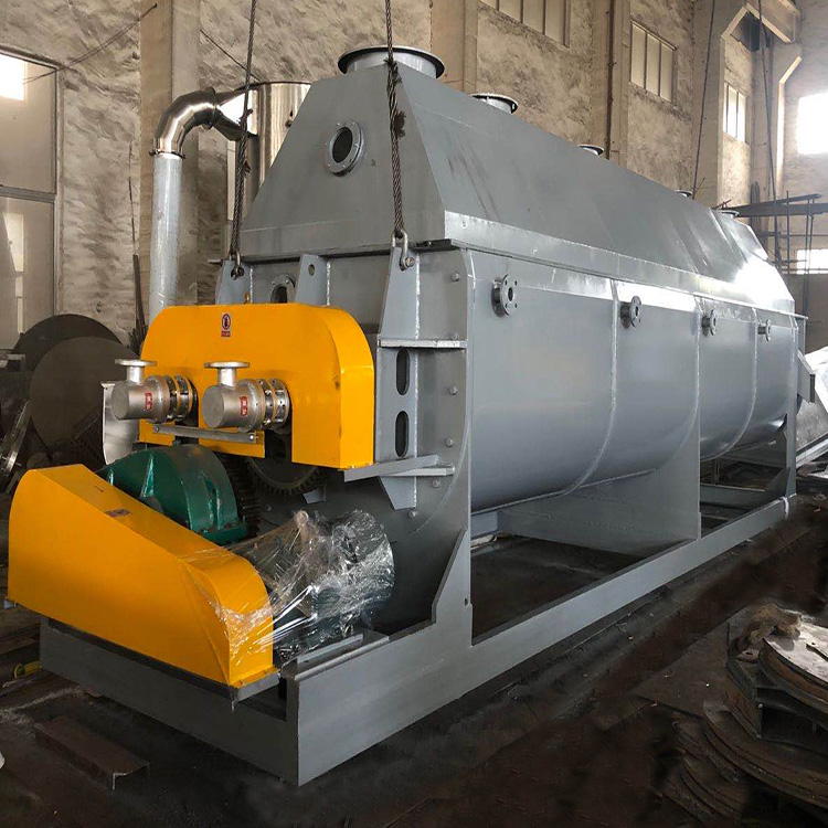 槳葉式干燥機(jī)是一種以傳導(dǎo)為主的臥式攪拌型干燥機(jī)。主體結(jié)構(gòu)為帶有夾套的W型殼體內(nèi)裝有成對的空心低速回轉(zhuǎn)中空軸,軸上焊有若干攪拌葉片,夾套和空心攪拌葉片,其內(nèi)均通以熱載體,兩種加熱面同時(shí)對物料加熱。熱載體通常從干燥機(jī)中部送入,通過呈攪拌狀態(tài)的物料層表面,從另一側(cè)排出。
