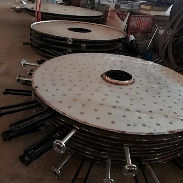 濕物料自加料器連續(xù)地加到干燥器上部一層干燥盤上,帶有耙葉的耙臂作回轉運動使耙臂作回轉運動使耙葉連續(xù)地翻抄物料。物料沿指數(shù)螺旋線流過干燥盤表面,在小干燥盤上的物料被移送到外緣,并在外緣落到下方的大干燥盤外緣,在大干盤上物料向里移動并從中間落料口落如下一層小干燥盤中。大小干燥盤上下交替排列,物料得以連續(xù)地流過整個干燥器。中空的干燥盤內通入加熱介質,加熱介質形式有飽和蒸汽、熱水和導熱油,加熱介質由干燥盤的一端進入,從另一端導出。已干物料從一層干燥盤落到殼體的底層,被耙葉移送到出料口排出。濕份從物料中逸出,由設在頂蓋上的排濕口排出,真空型盤式干燥器的濕氣由設在頂蓋上的真空泵口排出。從底層排出的干物料可直接包裝。通過配加翅片加熱器、溶劑回收冷凝器、袋式除塵器、干料返混機構、引風機等輔機,可提高其干燥的生產(chǎn)能力,干燥膏糊狀和熱敏性物 料,可方便地回收溶劑,并能進行熱解和反應操作。