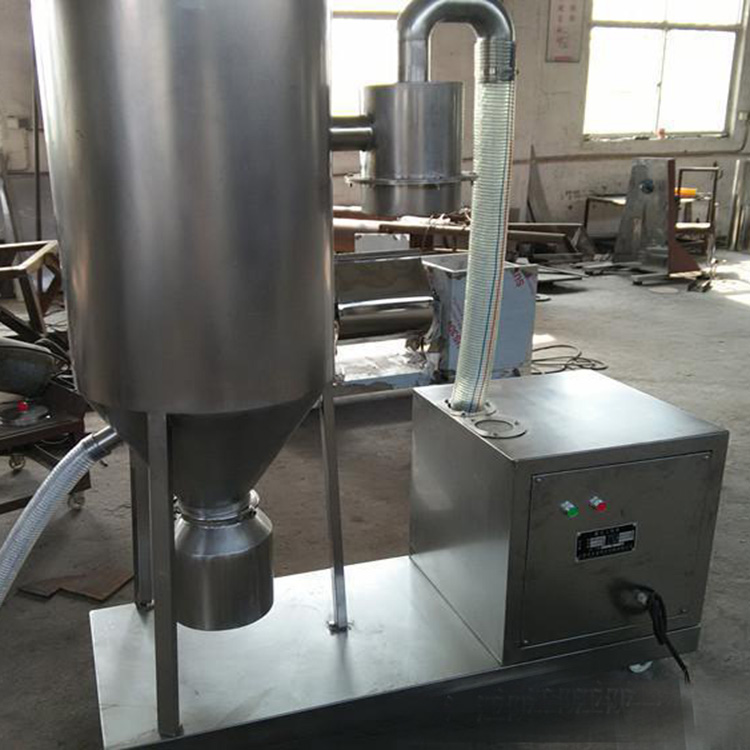 真空上料機(jī)由真空泵(無油、無水)、覆膜濾袋過濾器、壓縮空氣反吹裝置、氣動放料門裝置、真空料斗和不銹鋼可調(diào)吸料槍、輸送軟管等部件組成。