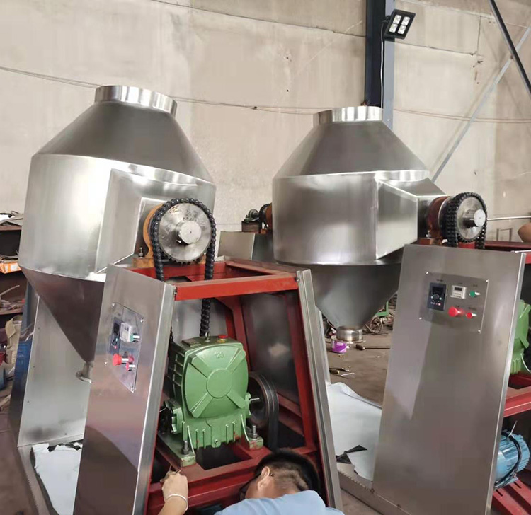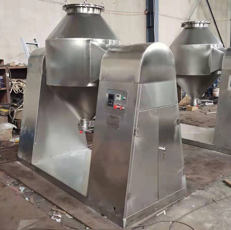 該機的工作過程是:把需混合的幾種物料通過真空輸送或人工加料投放到雙錐體內(nèi),上好筒蓋,開起設備,雙錐筒及攪拌葉片同時轉動,旋轉的雙錐筒使筒體內(nèi)物料產(chǎn)生紊亂翻滾混合,高速旋轉的攪拌葉片打碎結團物料,使物料在筒體內(nèi)快速混合。 SZH型雙錐混料機工作過程無死角,無沉積,可使混合的物料快速達到均勻一致的效果。